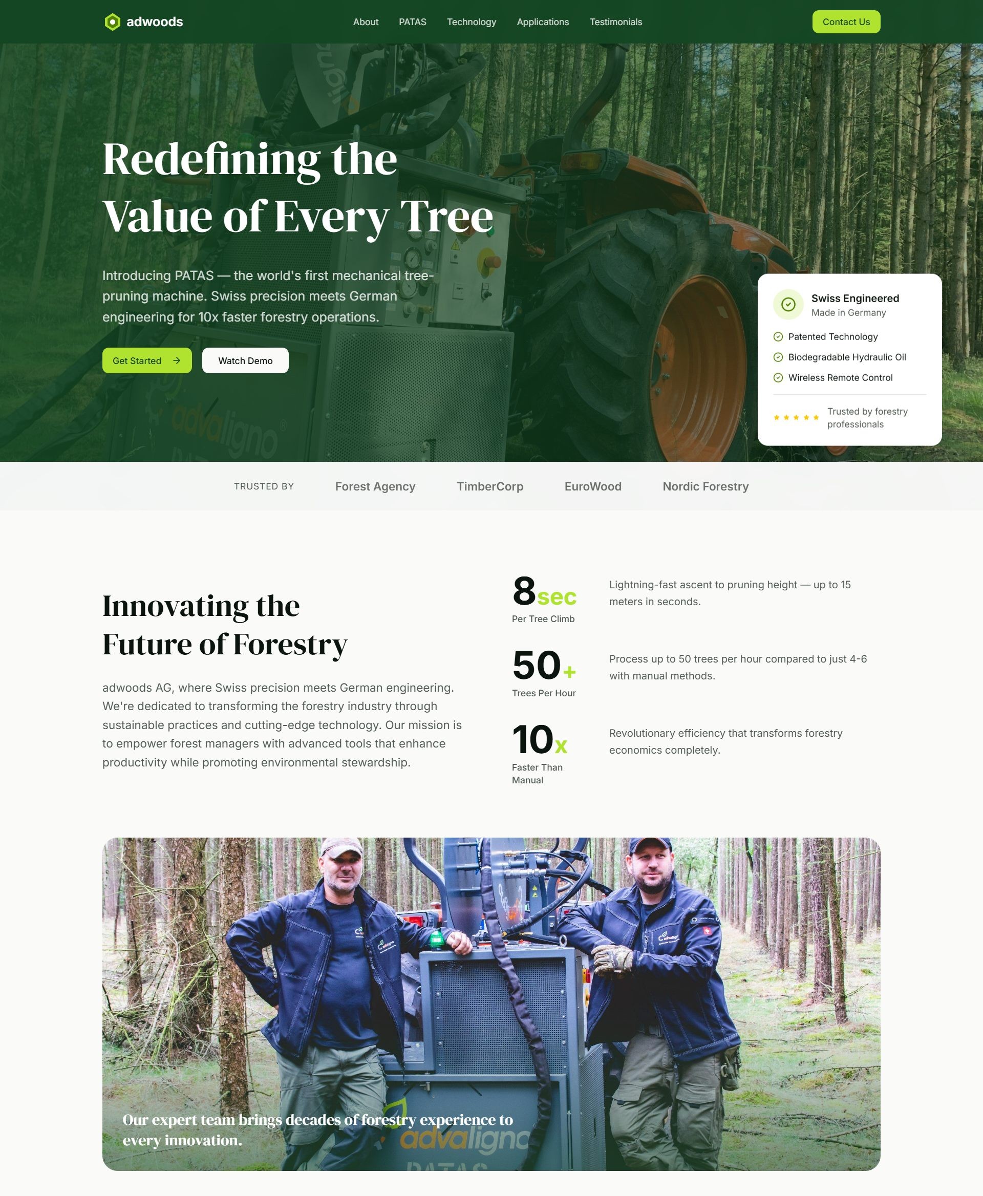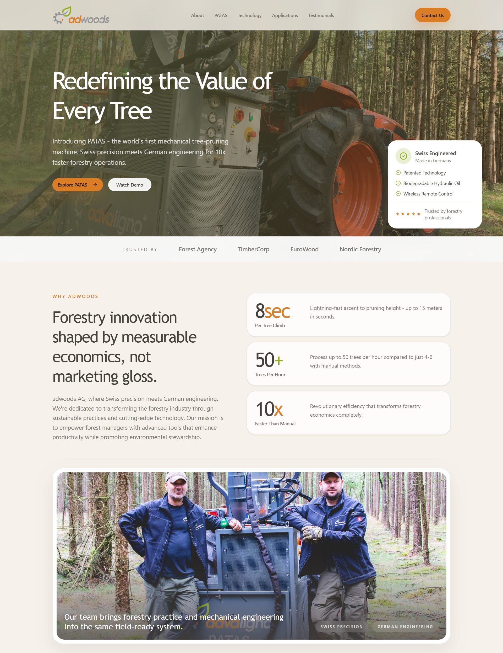 Der Markt reicht von klassischen Maschinenbau-Auftritten bis zu klar tech-orientierten Markenbildern. Für adwoods ist die spannendste Position weder rein konservativ noch rein Startup-getrieben, sondern eine glaubwürdige Verbindung aus technischer Kompetenz, Naturnähe und moderner Premium-Wahrnehmung.